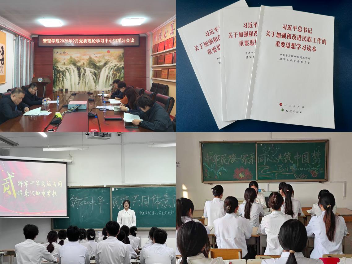 29/ 2025-09管理学院开展“石榴花开结同心 携手共筑中国梦”专题系列活动为深入贯彻落实中央民族工作会议精神,全面铸牢中华民族共同体意识,管理学院结合《关于开展民族团结进步宣传月系列活动的通知》要求,围绕“石榴花开结同心携手共筑中国梦”核心主题,聚力“谋实策、出实招、求实效”,以精准化举措强根基、以立体化宣传扩覆盖、以暖心化服务护成长,推动民族团结进步系列活动层层深入、全面铺展。夯基固本,紧握民族团结“指挥棒”。学院党委召开理论学习中心组学习会议,深入学习并为全体党支部书记发放了《习近平总书记关于加强和改进民族工作的重要思想学习读本》,全面传达学校活...