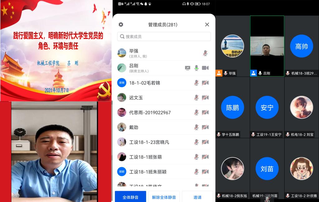 08/ 2021-10机械学院开展“喜迎国庆72周年 唱响校园主旋律”主题教育系列讲座10月1日以来,机械工程学院为进一步加强大学生理想信念教育、担当社会责任、弘扬时代精神、培育和践行社会主义核心价值观,营造浓厚的爱党、爱国、爱社会主义教育氛围,唱响思想政治教育工作主旋律,紧密围绕庆祝新中国成立72周年重要时间节点,结合当前疫情防控形势,在全院范围内开展了国庆主题思政教育、疫情防控形势要求、个人防护知识能力、心理健康教育疏导、学校应急状态下学生教育管理等方面教育。学院党委书记吕刚以《...