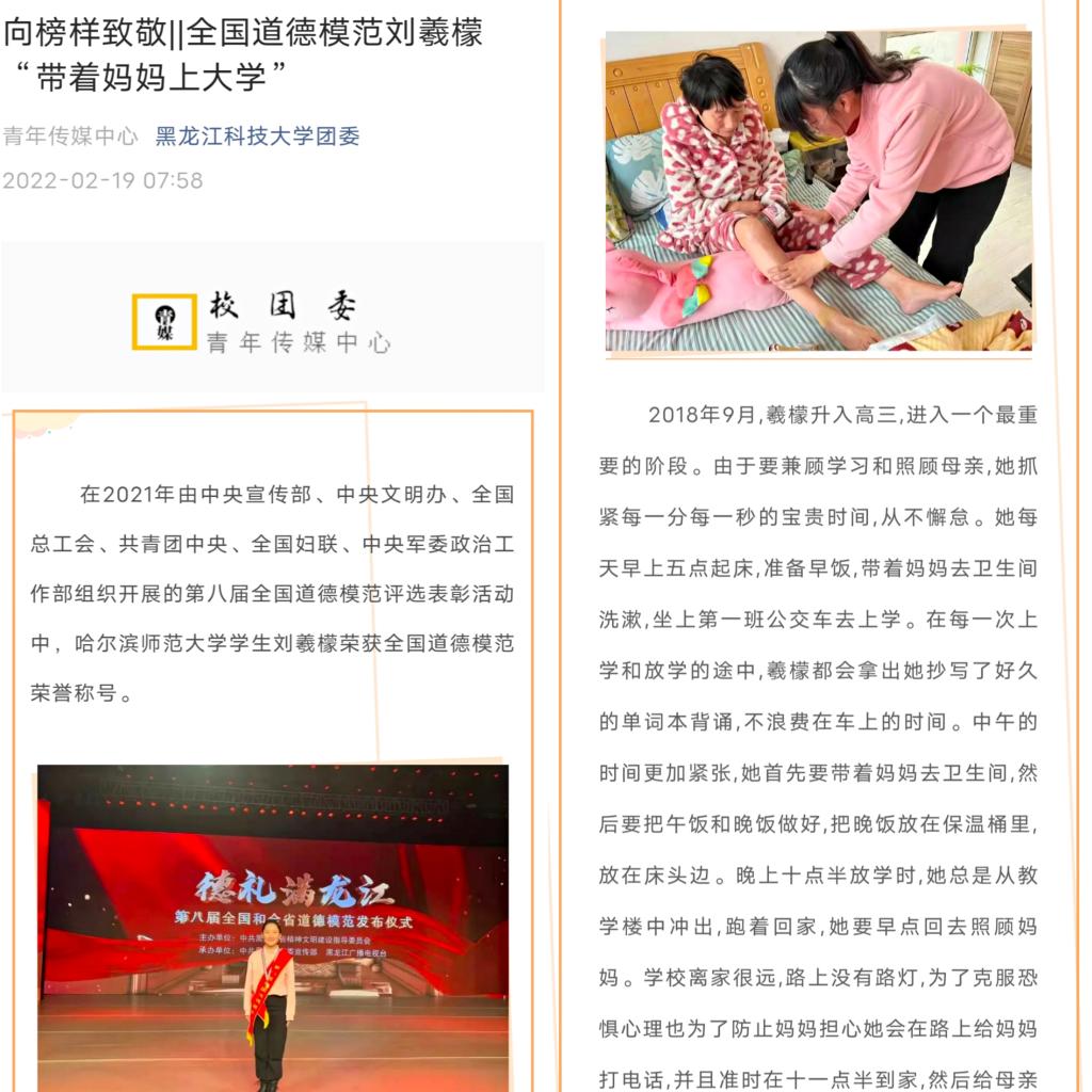 03/ 2022-03华体(中国)开展向第八届全国道德模范刘羲檬同学学习活动为广泛宣传道德模范的先进事迹,营造学习道德模范的浓厚氛围,弘扬中华传统美德,培育时代新风,按照省委教育工委《关于在全省大中小学生中开展向第八届全国道德模范刘羲檬同学学习的通知》工作安排,校团委近期在全校青年学生中组织开展了向第八届全国道德模范刘羲檬同学学习活动。刘羲檬是黑龙江省大庆市肇源县人,哈尔滨师范大学大三学生。由于母亲患有严重的类风湿瘫痪在床,这个“00后”女孩,十几年如一日照顾母亲,用她...