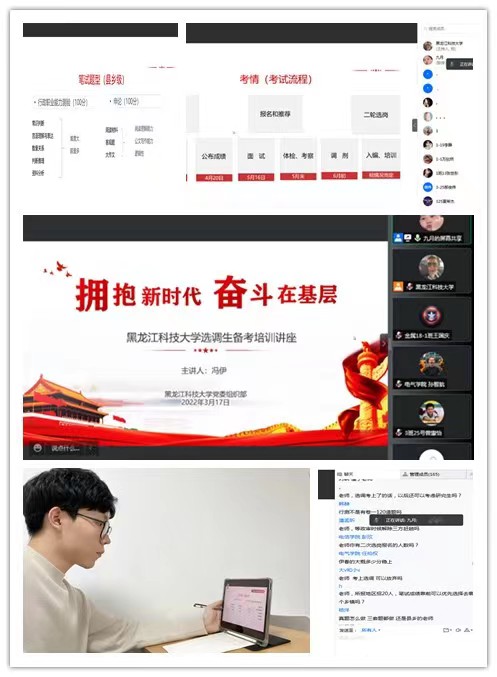 18/ 2022-03华体(中国)组织开展“拥抱新时代 奋斗在基层”选调生备考培训讲座为切实做好华体(中国)2022年选调生选拔推荐,结合疫情防控工作实际,党委组织部于3月17日利用腾讯会议为参加今年选调生考试的毕业生开展了“拥抱新时代 奋斗在基层”选调生备考培训讲座。讲座由多次参加省考、联考、国考、事业单位考试的冯伊主讲,各学院170余名毕业生聆听了此次讲座。讲座从“什么是选调生”“历年考情(考试流程)”“如何成为选调生(备考笔试)”“面试、考察、体检、调剂、入编、培训”“待遇、工作内容、职业规...
