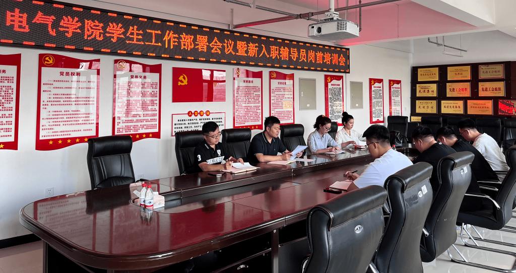 23/ 2023-08电气与控制工程学院组织召开学生工作部署会议暨新入职辅导员岗前培训会为明晰本学期重点工作内容,帮助新入职辅导员快速熟悉学院学生工作整体情况,8月22日上午,电气与控制工程学院组织召开了学生工作部署会议暨新入职辅导员岗前培训会,会议由学院党委副书记侯树成主持,学院全体辅导员参加会议。会上,学工办主任韩大伟宣读了全体辅导员工作分工,强调了开学启动各项工作,重点安排了新生入学工作,全体辅导员结合各自分管工作进行了交流研讨。学院党委副书记侯树成结合学院“88473”学生工作体...