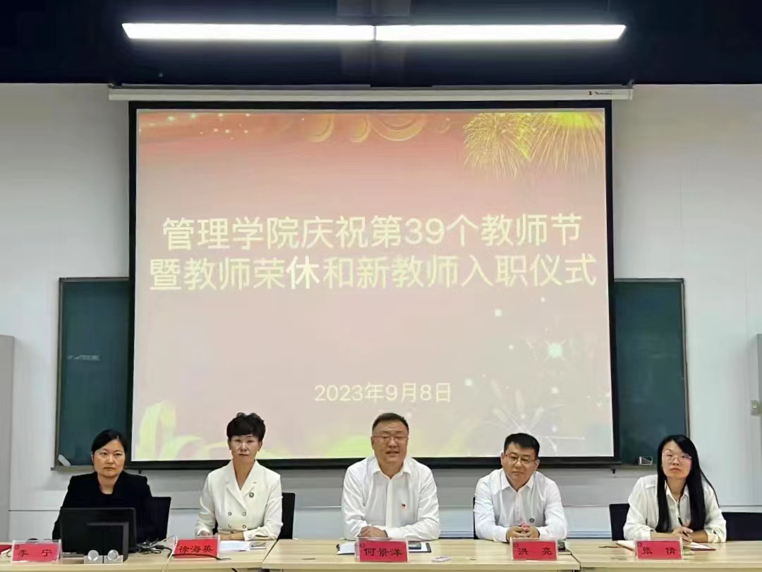 11/ 2023-09管理学院召开庆祝第39个教师节暨教师荣休和新教师入职大会为弘扬尊师重教的良好风尚,增强教师的使命感、荣誉感和归属感,提高教师的师德素养和业务能力、激励广大教师积极投身教育强国建设实践。9月8日中午,管理学院在一楼ERP教室召开了庆祝第39个教师节暨教师荣休和新教师入职大会。学院全体教职工参加,会议由学院党委副书记徐海英主持。会上,老教师荣休仪式环节,院长洪亮代表学院致辞,对孔凡玲、岳璞两位教授的光荣退休致以敬意和祝福,高度肯定并衷心感谢两位老师对学院的建设...