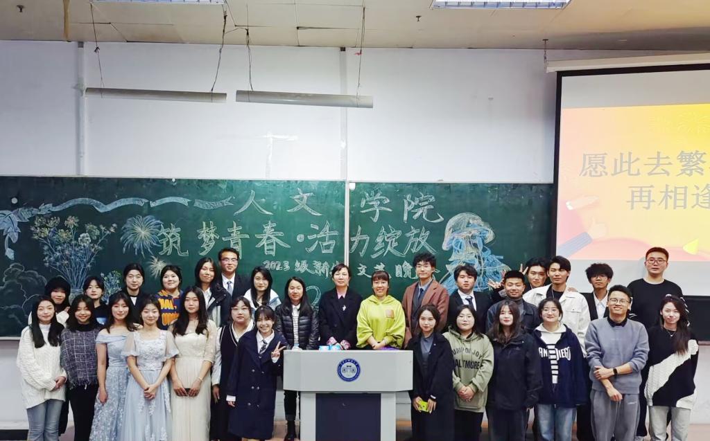 25/ 2023-10人文学院举办“筑梦青春,活力绽放”新生文艺晚会为进一步丰富同学们的校园文化生活,促进学生全面发展,充实学生文娱活动,营造积极向上的校园文化氛围,人文社会科学学院于2023年10月20日18:30在主楼ES0304举办“筑梦青春,活力绽放”新生文艺晚会。学院院长曹景萍、学工办主任张利南、2023级学生辅导员韩雪、社会学班主任张春艳及2023级全体学生共同观看。歌曲《最初的梦想》拉开了晚会的序幕,青春昂扬的歌声充盈整个晚会现场,调动了全场的气氛;随后,舞蹈《Rotate》《S...
