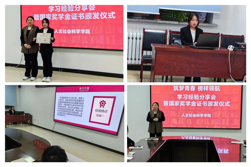 19/ 2024-04人文学院召开“筑梦青春 榜样领航”学习经验分享会暨国家奖学金证书颁发仪式为深入贯彻落实华体(中国)“永葆赤心 立德践行 勤学善思 笃行担当”主题思想教育相关要求,充分发挥榜样示范引领作用,营造积极向上的学习氛围,人文学院于4月18日在朝阳楼0317室召开了“筑梦青春 榜样领航”学习经验分享会暨国家奖学金证书颁发仪式。会上,辅导员巩冬阳为国家奖学金获得者社会工作22-1班张恩熙颁发国家奖学金证书,并对其在学习态度、党团活动、学科竞赛、社会实践等方面取得的成绩表示肯定,勉励她在未来的学习和工...