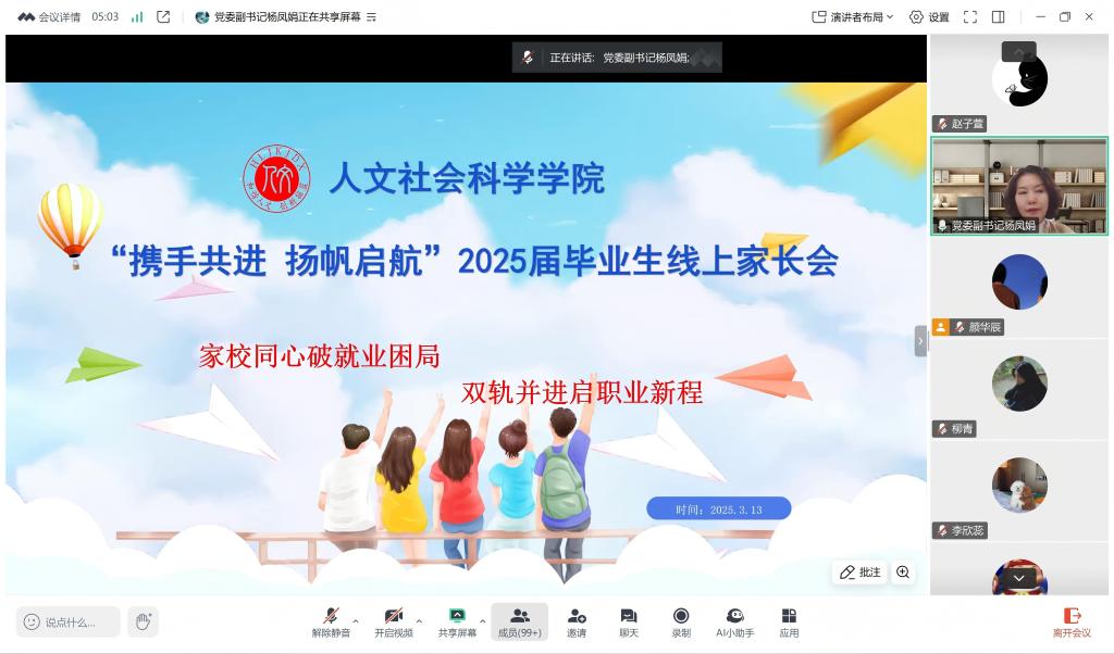 17/ 2025-03人文学院召开“携手共进 扬帆启航” 2025届毕业生线上家长会为深入贯彻落实学校《关于2025届毕业生就业工作推进会议》精神,进一步强化家校协同育人,形成教育合力,助推毕业生顺利就业,人文学院于3月13日召开“携手共进 扬帆启航”2025届毕业生线上家长会,学院党委副书记杨凤娟、全体辅导员以及2025届毕业年级全体学生家长参加会议,会议由学工办负责人巩冬阳主持。会上,就业辅导员颜华辰公布了学院2025届毕业生已签约情况,对学院“五位一体”就业工作体系进行详细解读。毕业年级辅导员韩雪分析了学生们面临的就业困境以及存在的就业问题,将学院已开展...