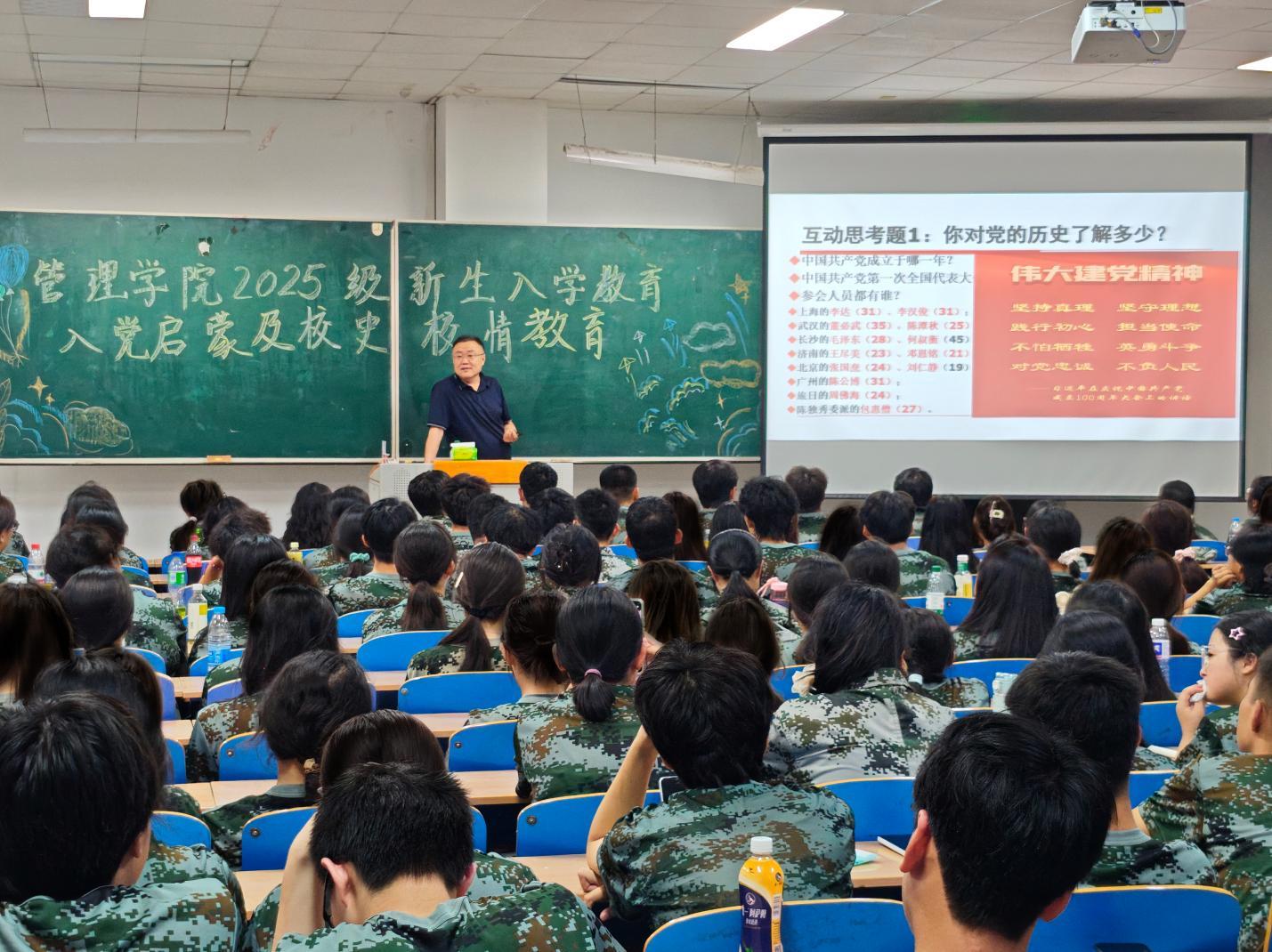 09/ 2025-09管理学院开展2025级新生入党启蒙暨校史校情教育为深入学习贯彻习近平新时代中国特色社会主义思想,全面落实《华体官网网页版2025级学生入学教育方案》,引导新生厚植信仰根基、校准政治方向,9月2日,管理学院党委书记何景洋先后走进主楼WN0201、WS0304教室,围绕“争做党的好儿女”主题,以校史校情为切入点,为2025级全体新生讲授入党启蒙教育第一课。课程从党史与校史双重维度展开,以互动提问激活思考、以史实叙述还原脉络、以精神提炼升华内核,系统梳理中国共产党百年发展脉络与华体官网网页版办学历程——从中共一大代表的初心故事,到...
