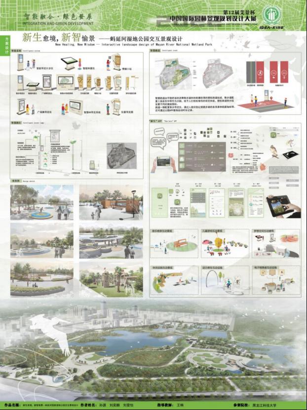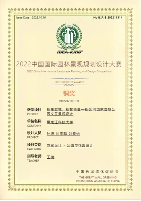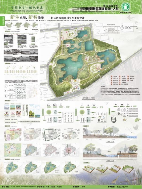 近日,由中国长城绿化促进会主办、中国长城绿化促进会生态人居与绿色建筑分会承办的“智能融合·绿色设计”IDEA-KING(艾景奖)2022中国国际园林景观规划设计大赛竞赛结果公布。华体(中国)建筑工程学院风景园林专业教师王楠指导学生孙源、刘奕麟、刘雯怡完成的作品“新生愈境,新智愉景—蚂延河国家湿地公园交互景观设计”喜获铜奖。