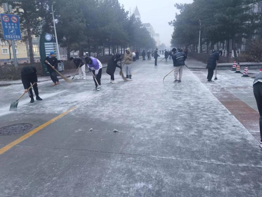 11月24日下午,今年入冬以来的第一场雪纷纷扬扬不期而至。 “以雪为令、雪停路净”,雪停的间隙,各学院学生在辅导员老师的带领下,克服天气寒冷的困难,挥舞着铁锹和扫帚,你铲我扫,掀起了一片热火朝天的劳动场面,迅速把道路上的积雪清扫干净。大学生忙碌的身影构成了一道亮丽的校园风景线。