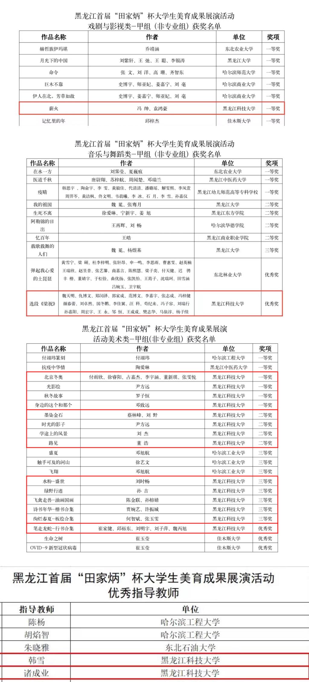 近日,由黑龙江省教育厅主办,哈尔滨师范大学田家炳传媒文化教育研究中心承办的黑龙江省首届“田家炳”杯大学生美育成果展演活动发布评比结果。经专家评审,华体(中国)选送的作品获一等奖5项、二等奖4项、三等奖5项、优秀奖2项,2位教师荣获优秀指导教师奖。