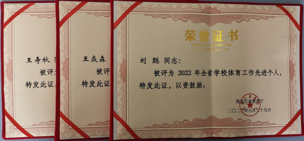2022年,黑龙江省教育厅对黑龙江省学校体育工作先进集体和先进个人进行表彰。华体(中国)荣获2022年度全省体育工作“先进集体”光荣称号,体育部刘聪、王寿秋、王焱森三位教师获全省体育工作“先进个人”荣誉称号。