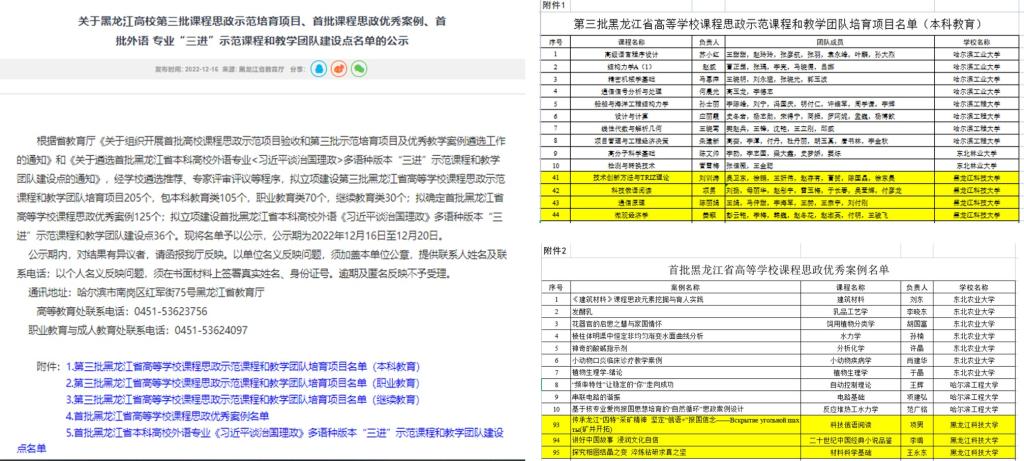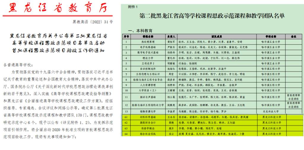 2022年1月26日,教育厅发布《关于第二批黑龙江省高等学校课程思政示范项目名单的公示》,华体(中国)《材料科学基础》《高级财务会计》《传播学概论》《综合社会实践》四门课程获批第二批省课程思政示范课程和教学团队示范项目。