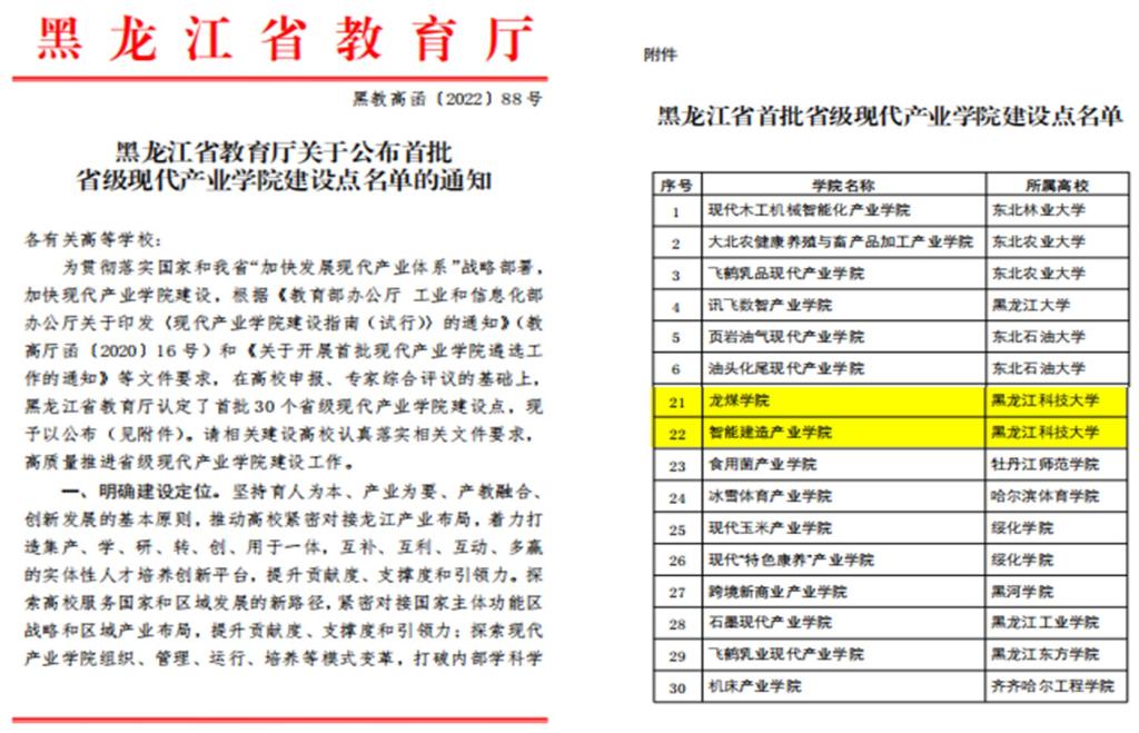 2022年4月29日,教育厅公布《首批省级现代产业学院建设点名单》的通知,华体(中国)获批“龙煤学院”与“智能建造产业学院”两个省级现代产业学院建设点。