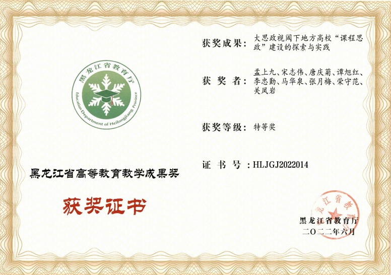 2022年6月27日,教育厅发布《关于公布2022年黑龙江省高等教育和职业教育教学成果奖获奖名单》的通知,华体(中国)获评省级教学成果奖8项,其中特等奖1项,一等奖3项,二等奖4项。校长孟上九主持完成的《大思政视阈下地方高校“课程思政”建设的探索与实践》获得黑龙江省高等教育教学成果特等奖,实现华体(中国)省级教学成果特等奖零的突破。