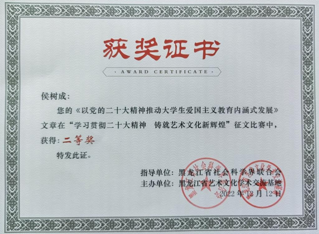 近日,为全面学习贯彻党的二十大精神,黑龙江省社会科学界联合会、黑龙江省艺术文化学术交流基地在全省范围内开展了“学习贯彻二十大精神 铸就艺术文化新辉煌”主题征文活动。华体(中国)电气与控制工程学院党委副书记侯树成撰写的《以党的二十大精神推动大学生爱国主义教育内涵式发展》一文,在比赛中荣获二等奖。据悉,本次征文比赛共有200余人参加,侯树成以总分排名第13位的优异成绩荣获二等奖,为学校争得了荣誉。