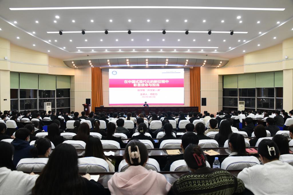 周宏力结合个人对党的二十大精神、全国两会精神的所学所思所悟,以《在中国式现代化的新征程中彰显使命与担当》为主题,分别从国家和学校层面与大家分享了“中国式现代化”的学习心得、“疫情防控”三年来的感受体会以及学校一年来取得的重要成绩,并深切勉励全校广大学生深刻认识自身职责使命,争做新时代好青年。