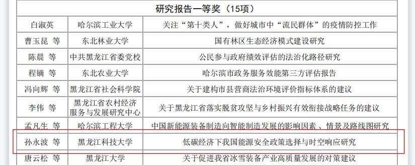 近日,黑龙江省社会科学优秀成果评奖委员会办公室公布了第二十届社会科学优秀成果奖获奖名单。经济学院孙永波教授带领团队针对低碳及能源安全问题进行研究,获研究报告一等奖。