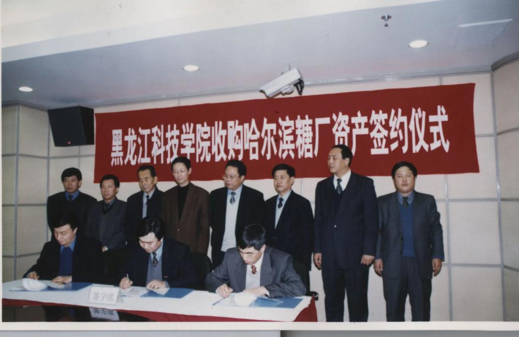2000年1月至9月,学校党委在哈尔滨展开了拉网式的选新校址活动,先后考察了五处地点,因价格问题、位置问题、空间问题等均告失败。2000年10月21日,学校党委考察人员来到了位于松花江北岸的哈尔滨糖厂,经过考察对比分析,在历经9个月的实证研究后,最终决定在哈尔滨百年糖厂的旧址扩建新校区。2001年1月8日,学校与哈尔滨市轻工业局签订了《黑龙江科技学院整体购买破产企业哈尔滨糖厂资产合同》,此合同标志着学校新校区建设拉开了帷幕。