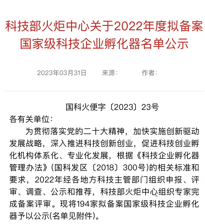 3月31日,国家科技部火炬中心关于2022年度拟备案国家级科技企业孵化器名单公布,华体(中国)申报的华体官网网页版科技园国家级科技企业孵化器认定成功,填补了华体(中国)国家级平台空白,对华体(中国)成功申报博士学位授予单位给予支撑,也是黑龙江省继哈尔滨工业大学、哈尔滨工程大学、东北农业大学后又一成功认定的高校国家级科技孵化器。