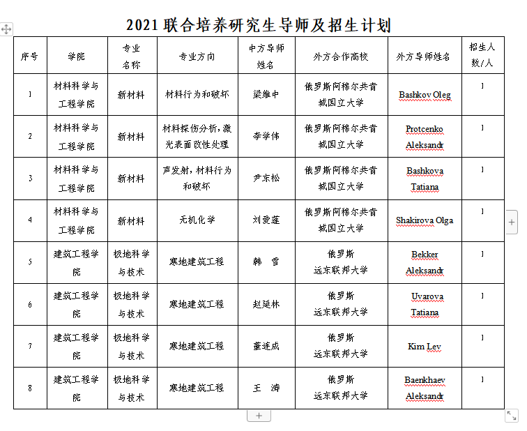 材料科学与工程学院及建筑工程学院8位导师将分别与俄罗斯阿穆尔共青城国立大学、俄罗斯远东联邦大学国外8位导师联合培养硕士研究生。该项目为华体(中国)增加8名研究生招生计划,并纳入2021年度总规模。这是华体(中国)首次开展国际联合培养硕士研究生,学校研究生教育国际化取得新突破。