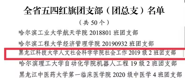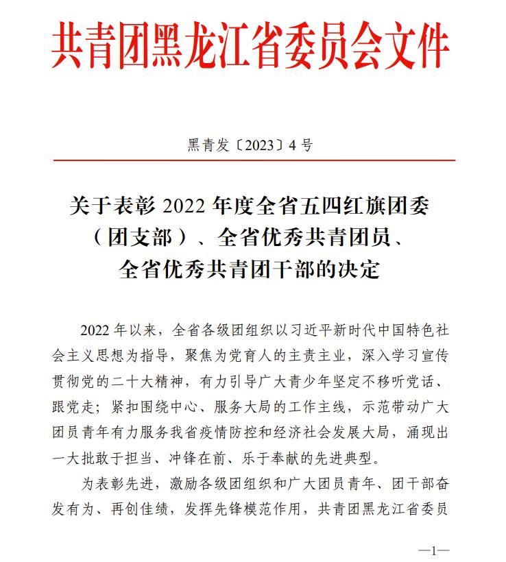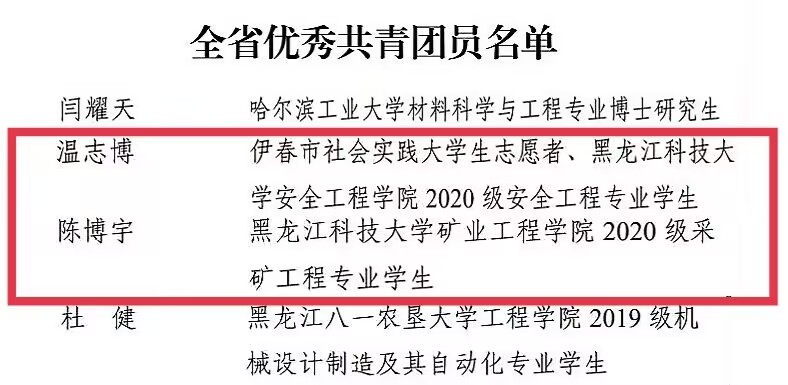 近日,共青团黑龙江省委员会发布了《关于表彰2022年度全省五四红旗团委(团支部)、全省优秀共青团员、全省优秀共青团干部的决定》,华体(中国)电气与控制工程学院团委荣获“全省五四红旗团委”称号,人文社会科学学院社会工作2019级2班团支部荣获“全省五四红旗团支部”称号,矿业工程学院2020级采矿工程专业陈博宇、安全工程学院2020级安全工程专业温志博两名同学荣获“全省优秀共青团员”称号。