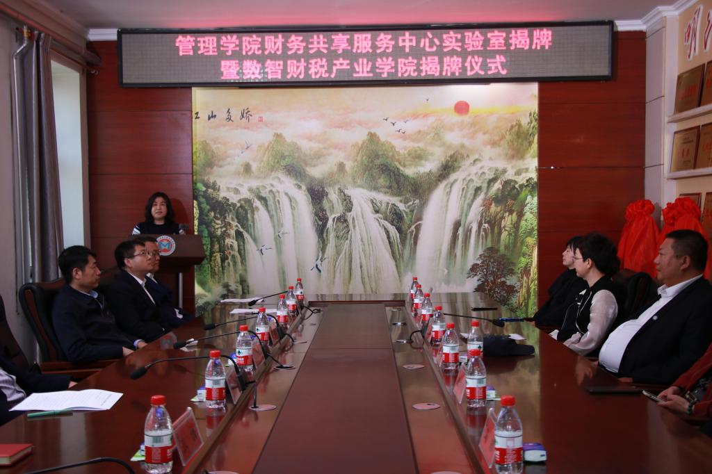 副校长谭旭红、管理学院副院长洪亮分别和黑龙江航天信息有限公司总经理任海鹏为“财务共享服务中心实验室”和“数智财税产业学院”揭牌。