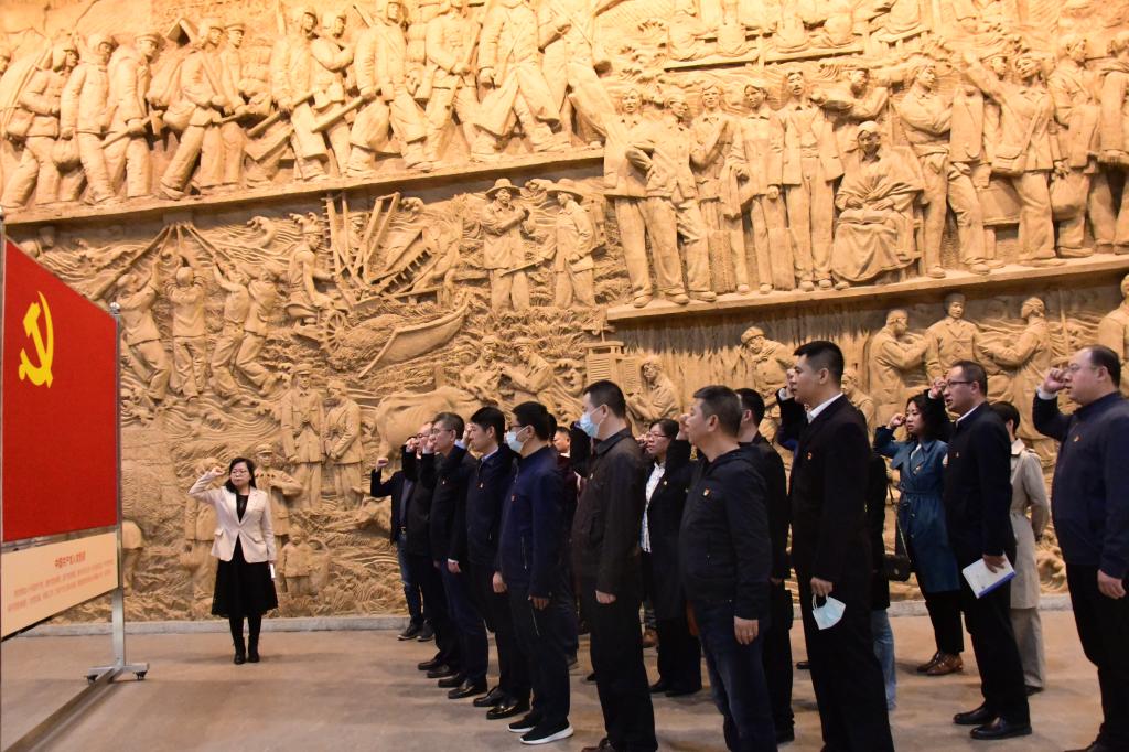 在大型浮雕《北大荒颂》前,党支部书记刘春丽带领全体党员干部,面对鲜红党旗,庄严地举起右手,重温入党誓词,发出为共产主义奋斗终身的铮铮誓言,表达了坚定不移听党话、踔厉奋发跟党走的信心和决心。
