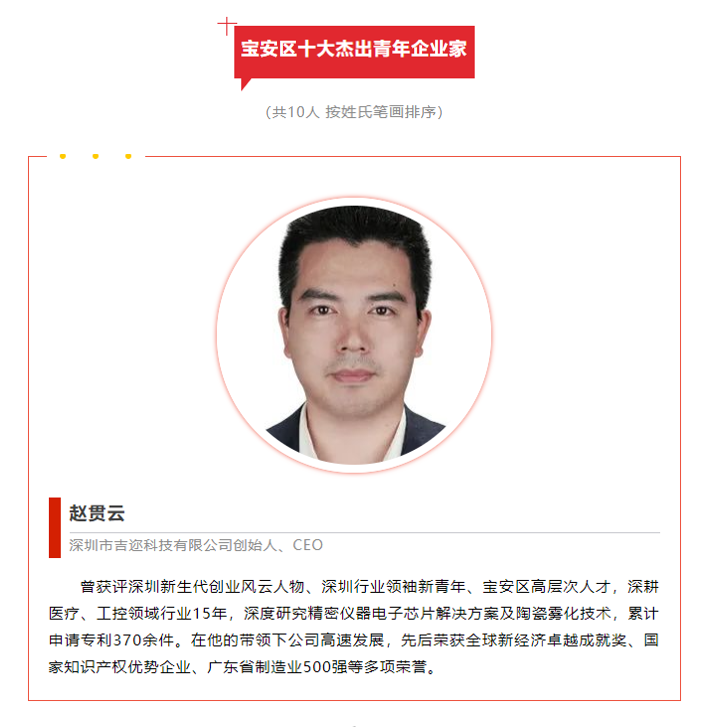 近日,由深圳市宝安区团区委、区工商联举办的首届“宝安区十大杰出青年企业家”评选结果正式公布,华体(中国)2001级计算机科学与技术专业校友、吉迩集团创始人、CEO赵贯云被评为“宝安区十大杰出青年企业家”。