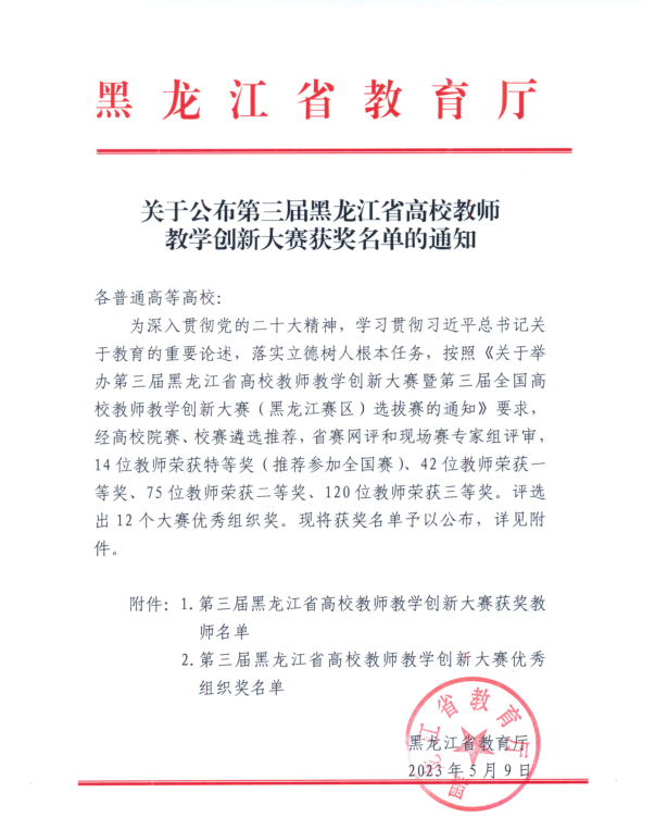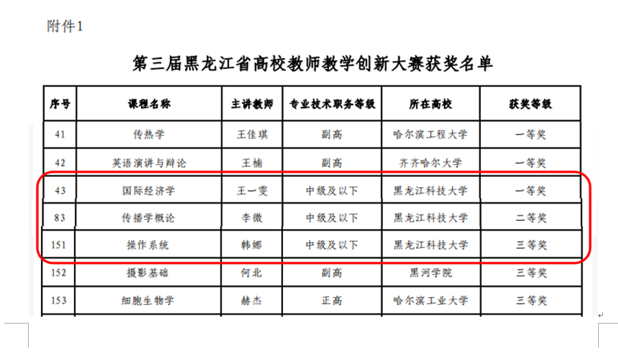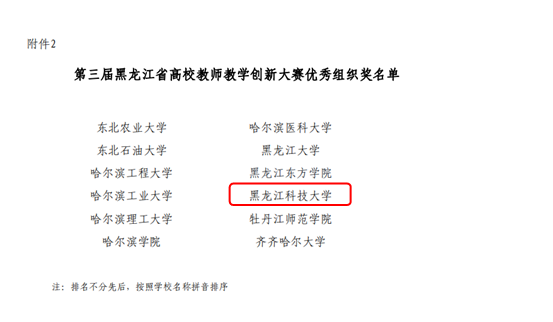 近日,由黑龙江省教育厅主办、哈尔滨医华体官网网页版学承办的第三届黑龙江省高校教师教学创新大赛暨全国高校教师教学创新大赛(黑龙江赛区)选拔赛落下帷幕。华体(中国)经济学院王一雯教师团队荣获新文科组一等奖,人文学院李微教师团队荣获课程思政组二等奖,计算机学院韩娜教师团队荣获新工科组三等奖。华体(中国)获得大赛优秀组织奖。