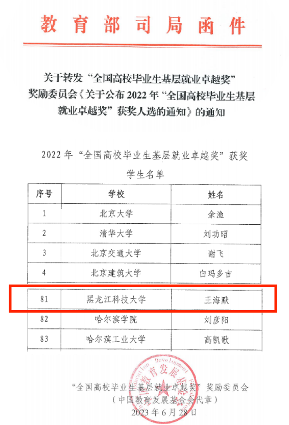 据悉,“全国高校毕业生基层就业卓越奖”由教育部高校学生司、教育部学生服务与素质发展中心共同指导,中国长江三峡集团出资,中国教育发展基金会设立,主要奖励赴基层就业并做出突出业绩的普通高校毕业生和普通高校指导服务大学生赴基层就业工作有突出贡献的教师。经各高校组织推荐、各省级教育行政部门遴选推荐、奖励委员会审核确认,公示无异议后,全国共有398名优秀高校毕业生(黑龙江11名学生)获奖。