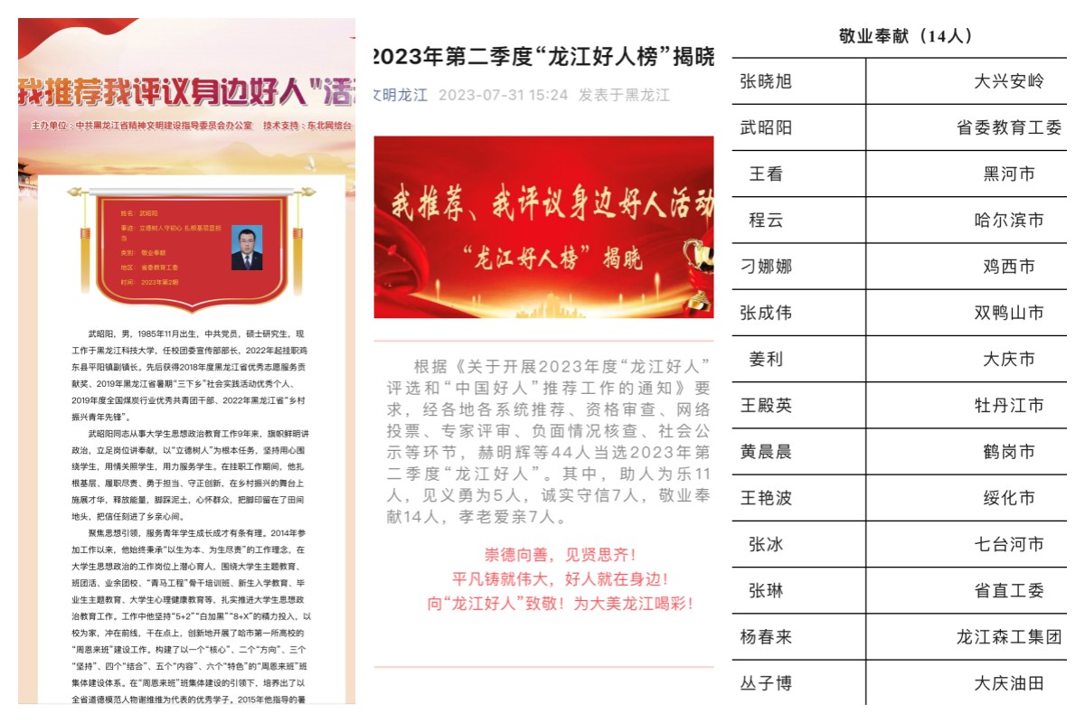 近日,由中共黑龙江省精神文明建设指导委员会办公室主办的“我推荐我评议身边好人活动”结果揭晓,省委教育工委以及学校共同推荐的华体(中国)武昭阳同志被评为2023年第二季度敬业奉献类“龙江好人”。