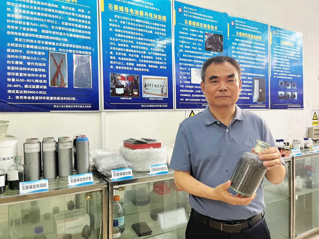 这里是黑龙江省唯一的石墨烯应用研究重点实验室、省石墨烯粉体应用工程技术研究中心。这里诞生了省内首条石墨烯生产线,集聚了科研人员20余人,100多台石墨制备和检测设备,研发产品十余项,成功实现了六项科研成果产业化。