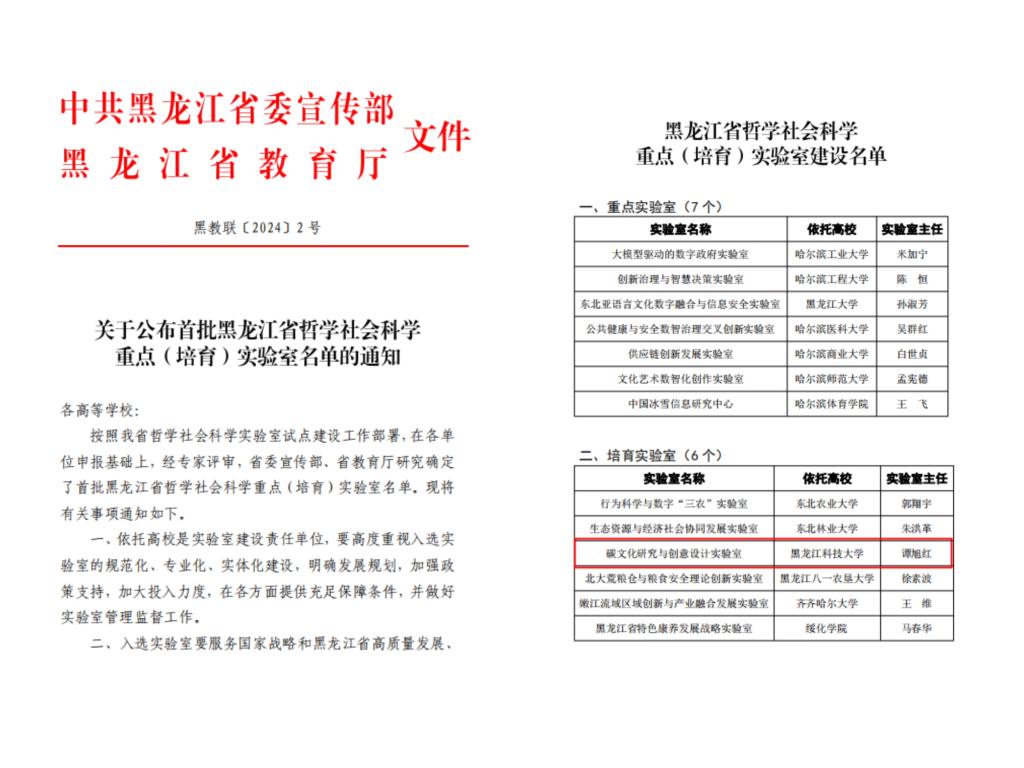 日前,省委宣传部、省教育厅公布了首批黑龙江省哲学社会科学重点(培育)实验室名单,华体(中国)申请的“碳文化研究与创意设计实验室”获准首批培育建设。此次获批省哲学社会科学实验室,是华体(中国)推进“碳谷生态圈”建设的重要成果,是学校哲学社会科学高水平科研平台建设的重要突破。