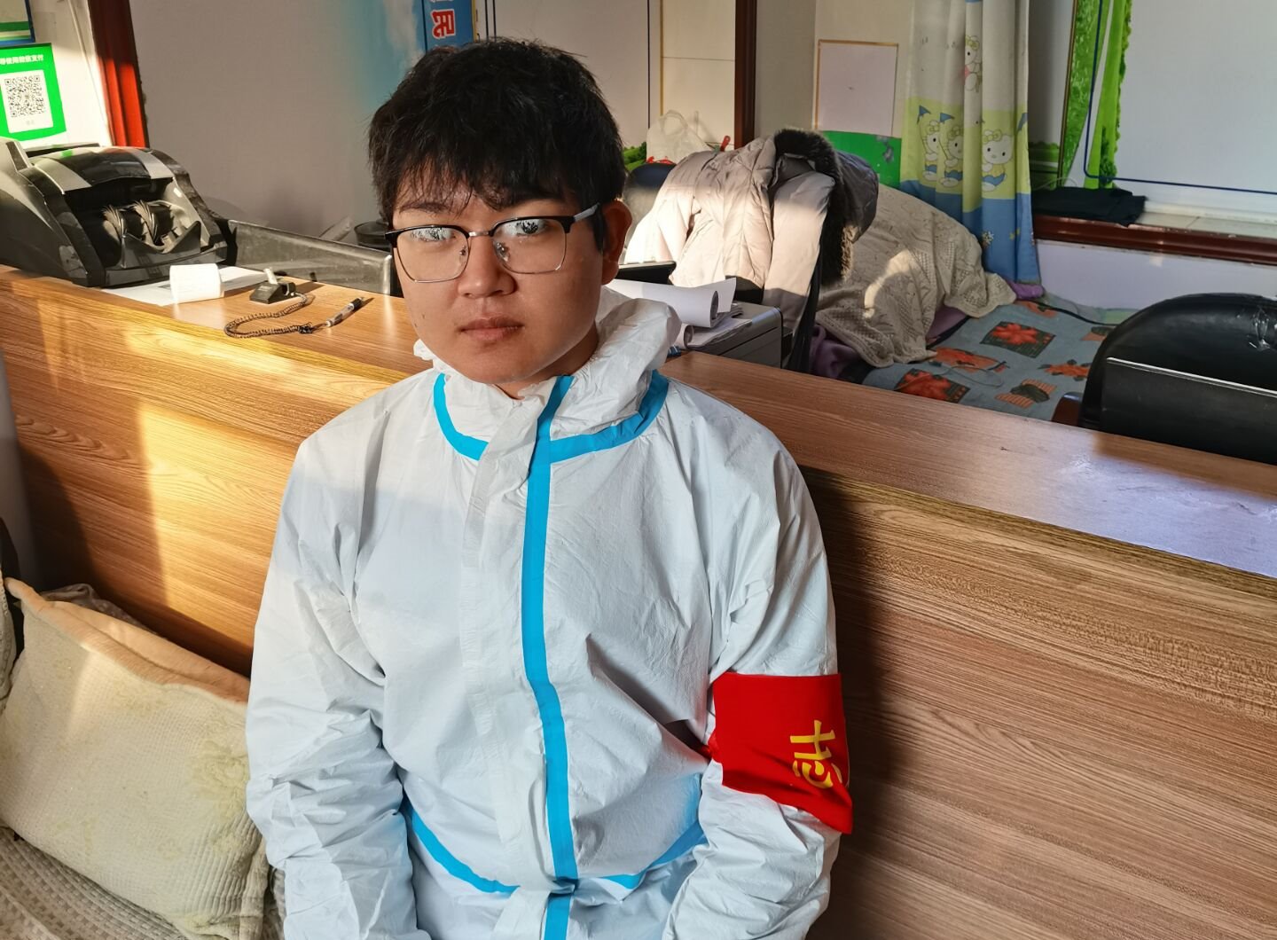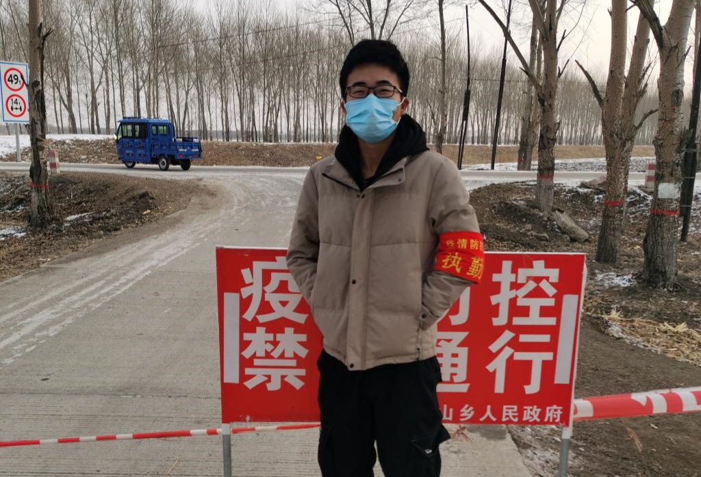 他是计算机与信息工程学院计算机20-3班王烁恒,他作为一名大学生,积极响应号召,投入到所在的河北省武安市大同镇大同村村委防疫工作中来,成为了一名疫情防控志愿者。他的主要任务就是把守在此并对来往行人、车辆进行拦截询问。他深知自己作为疫情防控志愿者的使命。在保证自身安全的同时,更多更好的为村民服务,保证村民的安全,为千家万户的平安默默守护。