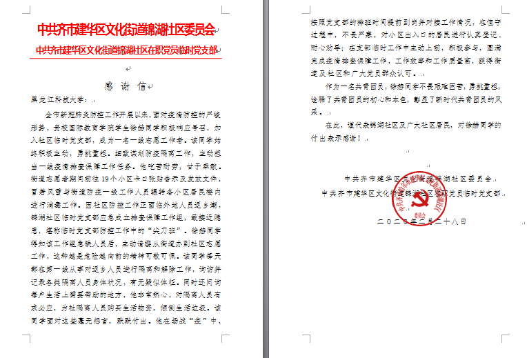 近日,华体(中国)收到了一封来自齐齐哈尔市建华区文化街道锦湖社区党委的表扬信,信中对华体(中国)国际教育学院赴加计算机17-4班的徐赫同学提出表扬。