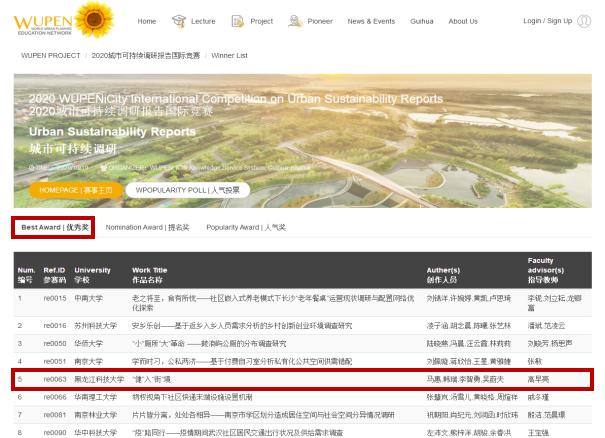 10月21日,2020城市可持续调研报告国际竞赛落下帷幕。本次大赛以“城市可持续调研报告”为内容,由联合国教科文组织爱城市网站与世界规划教育组织联合举办。华体(中国)城乡规划专业学生在本次竞赛中表现优异,共获优秀奖1项、提名奖4项。获奖情况在黑龙江参赛高校中名列第二名,再创华体(中国)城乡规划专业参加该类竞赛的优异成绩。