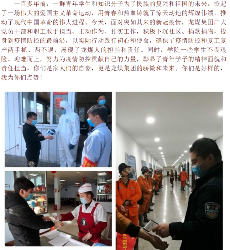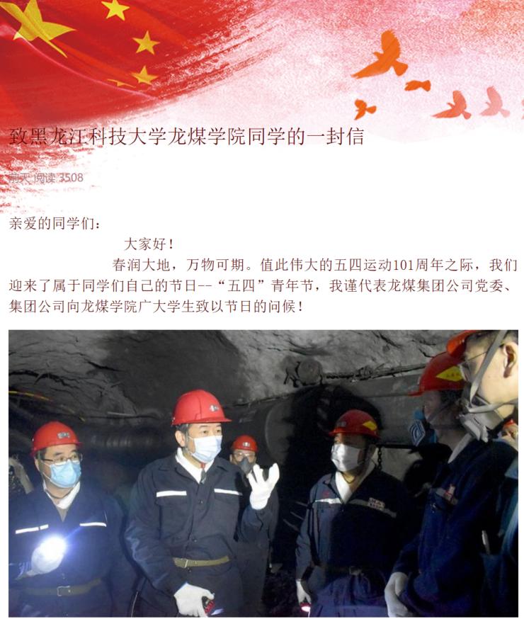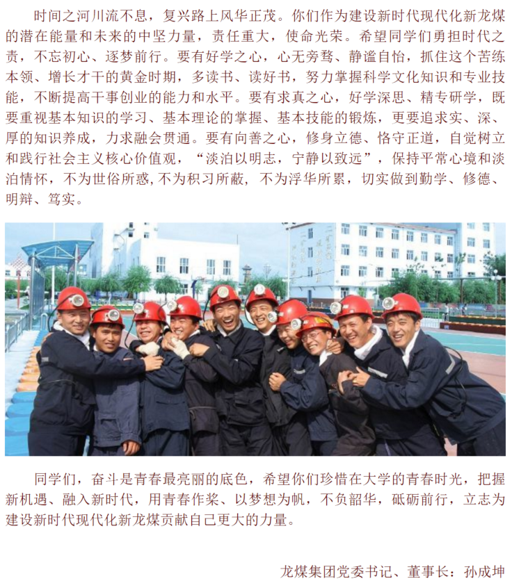 编者按:今年是五四运动101周年,同时也是龙煤学院学生在学校度过的第一个青年节。龙煤学院作为校企委托联合培养项目,是深入落实习近平总书记在推进东北振兴座谈会上的重要讲话和对黑龙江重要指示精神的务实举措,是服务龙江“六个强省”战略、推进四煤城转型发展、实现煤炭行业振兴的创新举措,标志着地方与学校、企业与学校协同创新、融合育人的战略合作步入了新的发展阶段。一直以来,龙煤学院学生的培养受到学校、龙煤集团、地方政府的高度重视。在五四青年节到来之际,龙煤集团党委书记、董事长孙成坤书写的《致华体官网网页版龙煤学院同学的一封信》,是为龙煤学院303名在籍学生送上的节日祝福与嘱托,希望广大青年学生树立以“爱矿业 兴煤碳”为己任,在为梦想奋斗的道路上书写人生华章。
