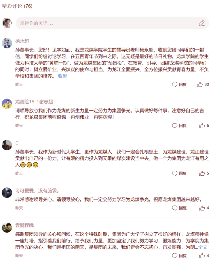龙煤学院师生收到孙成坤董事长的来信后,反响热烈,深受鼓舞,纷纷点赞评论并表示:一定会扎根龙江沃土,树立爱矿业、兴煤炭的使命和担当,为龙江全面振兴、全方位振兴贡献青春力量。