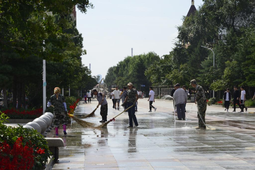 后勤工作人员清扫路面