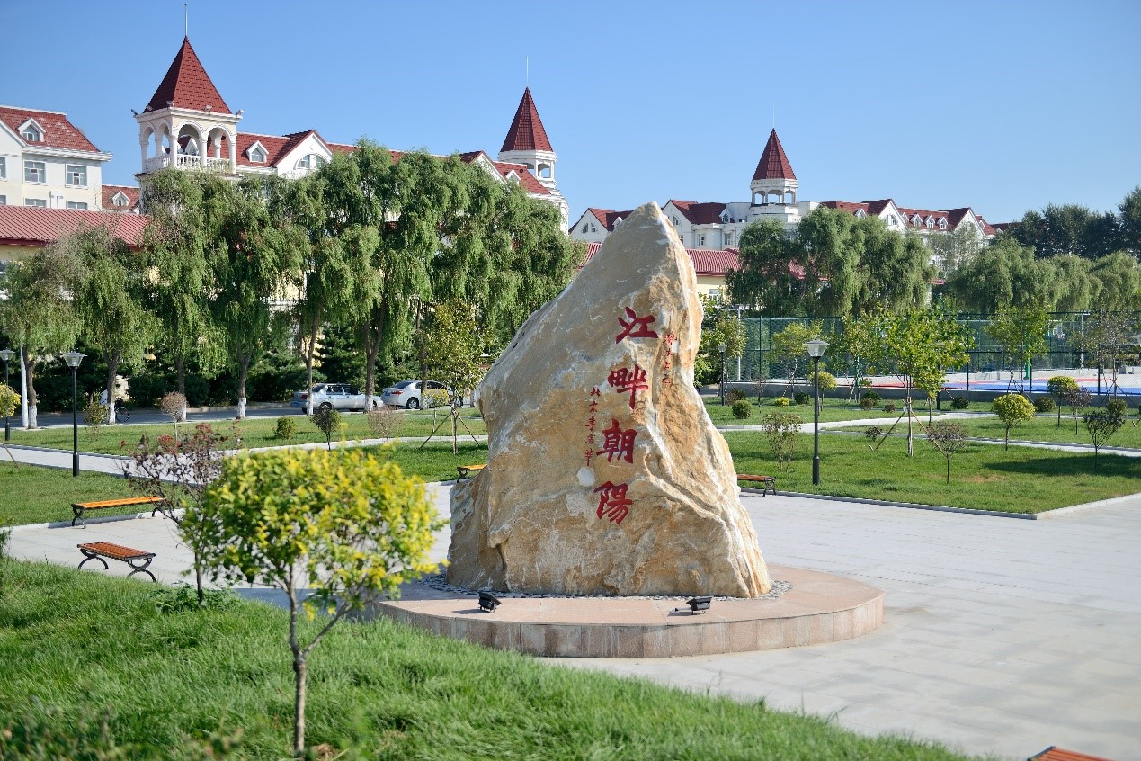 刻有“江畔朝阳”四个大字的巨石,源自于河北曲阳太行山脉,形成于晚太古代阜平群,距今已有25亿年以上,岩性为白色大理岩,俗称汉白玉。该石高5.2米,宽3.4米,厚2.6米,重53吨,造型优美,灵气十足,远远望去,好似一个少女在孜孜不倦地学习,故名“不倦石”。