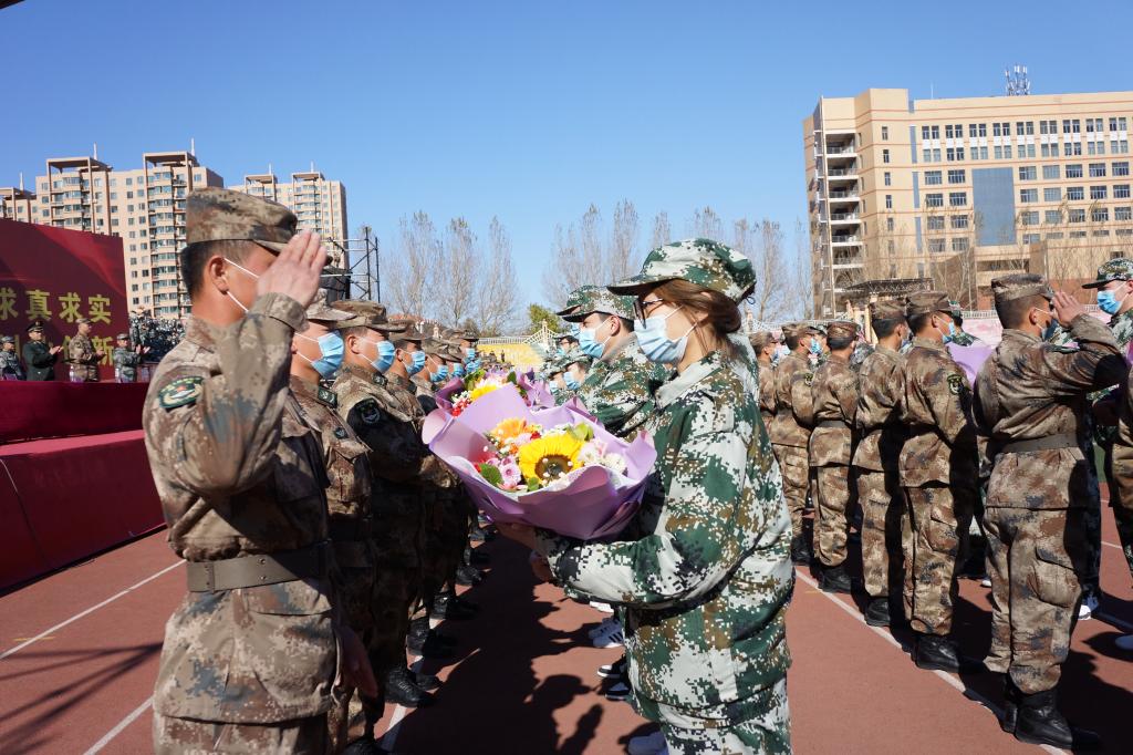 最后,举行了欢送教官仪式。全体新生高喊:“教官辛苦了!祝教官一路顺风!”,学生代表手捧鲜花为全体教官送行,表达真挚的祝福和美好的祝愿。