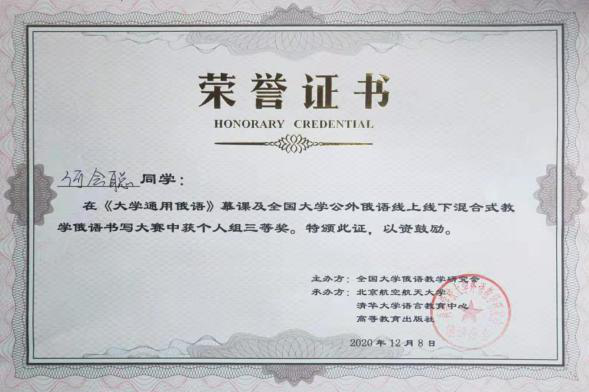 本次书写大赛来自全国高校的个人赛有效稿件共464份,以规范美观书写俄语课文和对话为内容进行投稿,所有作品由大赛举办方专家打分进行评选。国际教育学院俄语19-1班宋妍、俄语20-2班张瑞楠、刘金秋获得二等奖;俄语18-2班时弘云、俄语19-1班何会聪获得三等奖;俄语17-1班宫志颖等5名同学获优秀奖。