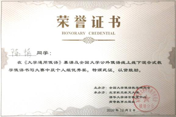12月7日由全国大学俄语教学研究会、北京航空航天大学《大学通用俄语》慕课团队、清华大学语言中心、高等教育出版社联合举办的《大学通用俄语》慕课及全国大学公外俄语线上线下混合式教学俄语书写大赛圆满落幕。在本届大赛中,华体(中国)国际教育学院俄语专业同学分获二等奖3项、三等奖2项、优秀奖5项。