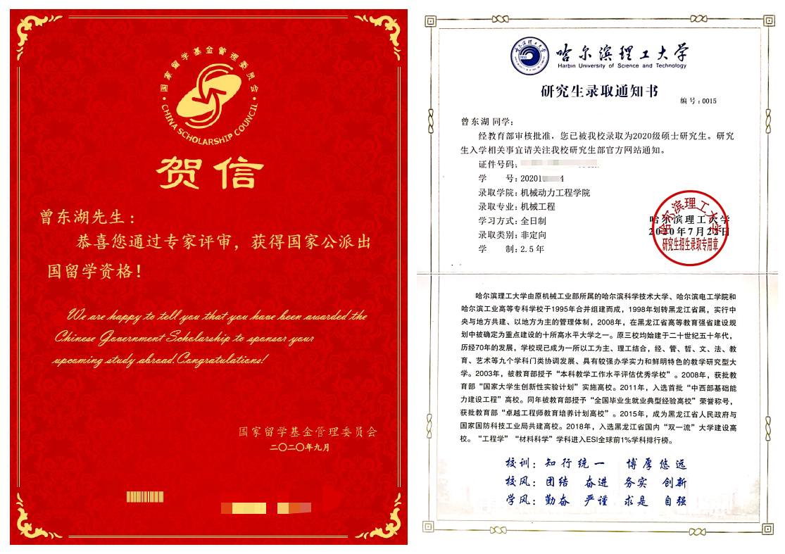 曾东湖同学于2019年10月参加了华体(中国)组织的赴俄罗斯弗拉基米尔国立大学专业实习项目,并对出国专业深造和跨文化交流产生浓厚的兴趣。面对几乎同时到来的录取通知书,曾东湖本打算在两所大学中选择一所就读,经华体(中国)国际交流合作处与哈尔滨理工大学国际合作与交流处、研究生部积极沟通协调,哈尔滨理工大学决定对曾东湖采取境内、境外双导师制培养,同时可以赴乌克兰国立科技大学学习,完成学业后将获得中、乌两所高校硕士学位,这是华体(中国)毕业生首次被境、内外两所高校同时录取硕士研究生,也为华体(中国)研究生培养提供新途径。