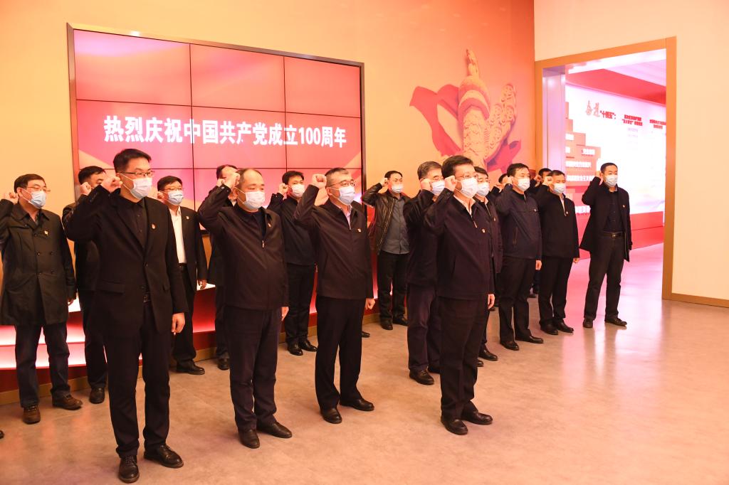 参观结束后,在周宏力领誓下,全体党员干部在“誓言厅”面对鲜艳的中国共产党党旗,重温入党誓词。