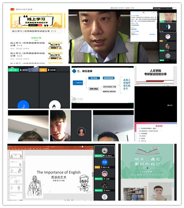 疫情防控期间,充分发挥互联网优势和新媒体资源,各级团学组织围绕青年学生关心的学习方法提升、未来发展规划、创业就业等内容,开展一系列朋辈互助“云分享”活动。矿业工程学院团委开展“学习身边榜样 不忘初心 继续前行”优秀学生线上经验分享会,电气与工程学院团委开展线上四六级经验分享会、优秀典型青年经验分享,建筑工程学院团委开展“朋辈引航,共勉共进”线上学习分享会、从“心”出发—大学生情绪管理及学习心理管理主题活动,计算机与信息工程学院团委开展“疫”期考研分享会,人文社会科学学院团委开展“学长引路”优秀毕业生分享会,校学生会组织开展了第七期“常青藤”论坛,邀请优秀学生典型分享学习经验。通过朋辈“云分享”活动,各级团学组织充分借助网络直播、在线答疑等学生喜闻乐见的方式,积极培育广大青年学生奋发向上的学习精神,开辟分享经验、互相激励的朋辈互助网络学习空间,激励青年学生疫情期间养成良好的学习习惯。