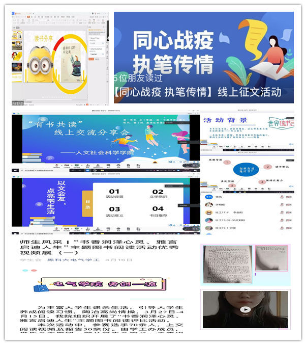 在第25个世界读书日即将来临之际,进一步丰富居家学生学习环境,提高青年学生的人文素养,营造书香致远的浓郁氛围,使青年学生在疫情期间居家阅读中增长知识、增进思考、提高品位,坚定文化自信。矿业工程学院团委开展“疫”期云诵读活动,电气与控制工程学院团委开展主题图书阅读活动,机械工程学院团委开展“读一本好书”观后感,材料科学与工程学院团委开展“青春”读书会,管理学院团委开展“疫中寻书—习语强心”读书分享会,理学院团委开展摘录书香气“云阅读”活动,积极倡导同学们在线上和线下平台选取自己喜爱的中华经典书目进行阅读,弘扬中华优秀传统文化。