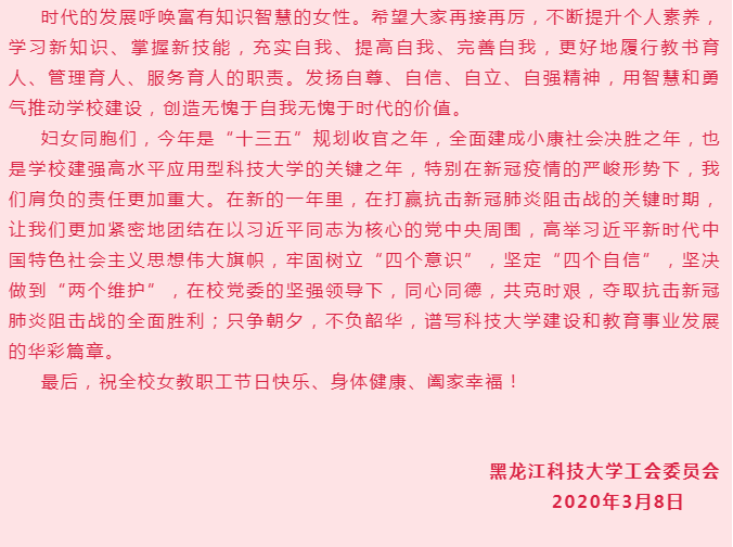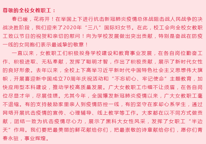 【2020年“三八”节】华体官网网页版致全校女教职工的慰问信