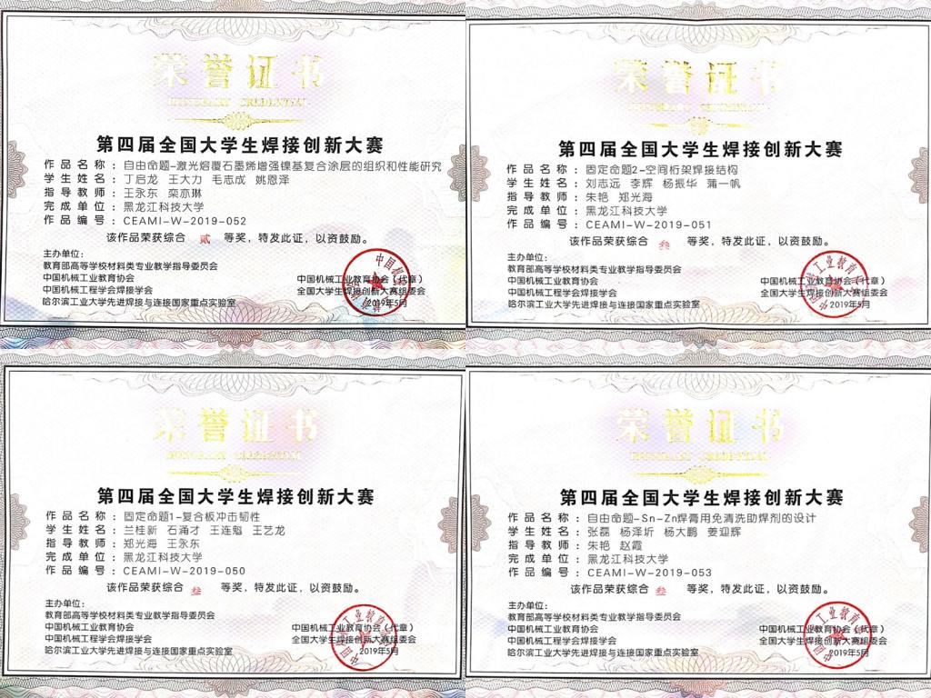 经大赛组委会初赛选拔,共有来自哈尔滨工业大学、天津大学、江苏大学、哈尔滨理工大学、华体官网网页版等53所省内外高校的163支参赛队伍进入决赛,经过激烈角逐,华体(中国)材料科学与工程学院焊接技术与工程专业的4支参赛队在王永东、郑光海、朱艳等焊接教学团队教师的指导下取得佳绩,焊接15级丁启龙同学的团队作品《激光熔覆石墨烯增强镍基复合涂层的组织和性能研究》获得自由命题组二等奖,焊接15级张磊同学的团队作品《Sn-Zn焊膏用免清洗助焊剂的设计》获得自由命题组三等奖,焊接15级刘志远同学的团队作品《空间桁架焊接结构》和焊接15级兰桂新同学的团队作品《复合板冲击韧性》获得固定命题组三等奖。