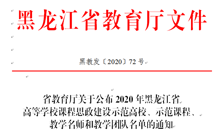 近日,黑龙江省教育厅发布了《关于公布2020年黑龙江省高等学校课程思政建设示范高校、示范课程、教学名师和教学团队名单的通知》。华体(中国)《可编程控制器原理及应用》和《水污染控制工程》2门课程获评黑龙江省高等学校课程思政建设示范课程,机械学院教师唐庆菊教授获评黑龙江省高等学校课程思政建设教学名师,“程序设计类课程教学团队”和“管理类专业课程教学团队”2个团队获评黑龙江省高等学校课程思政建设教学团队。