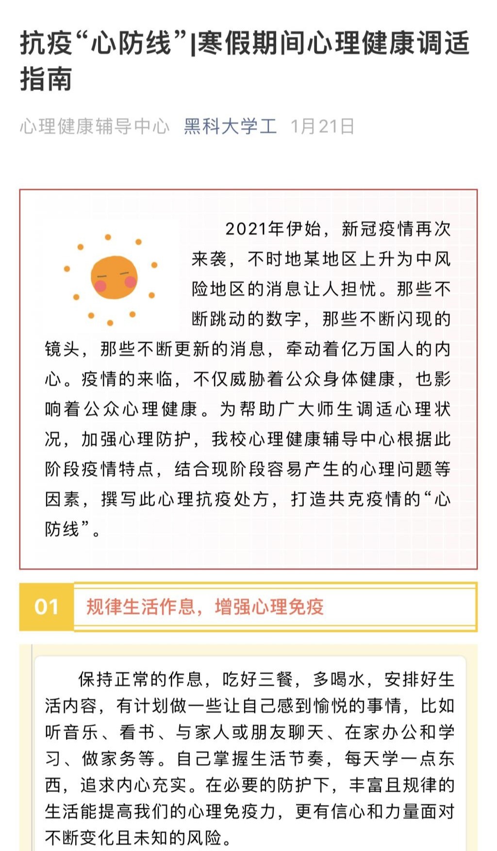 一是认真贯彻落实好疫情防控各项工作要求。按照上级工作部署要求,制定《2021年春季学期学生返校实施方案》,科学规范安排返校流程、返校批次及时间安排,确保做到安全防疫、正常返校、全面开学。全面开学后,学校通过微信、宣传橱窗、校园广播等宣传《高等学校春季学期新冠肺炎疫情防控技术方案(第三版)》《致全体华体官网网页版青年学生的倡议书》和相关疫情防控内容,在全校公共空间悬挂疫情防控宣传条幅,努力营造了大力弘扬伟大抗疫精神和志愿服务精神的良好氛围。
